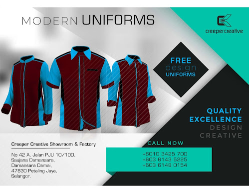Creeper Creative adalah pengeluar dan pembekal seragam khas. Lebih 12 tahun pengalaman dalam menyelesaikan masalah tempahan seragam customade. Tiada masalah saiz dan pelanggan berpuas hati dengan fabrik dan reka bentuk mengikut cadangan yang telah dipersetujui.